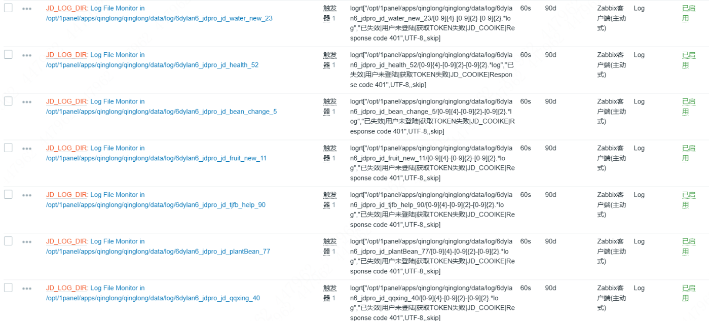 1 | logrt["{#DIRPATH}/[0-9]{4}-[0-9]{2}-[0-9]{2}.*log","已失效|用户未登陆|获取TOKEN失败|JD_COOIKE|Response code 401",UTF-8,,skip] |