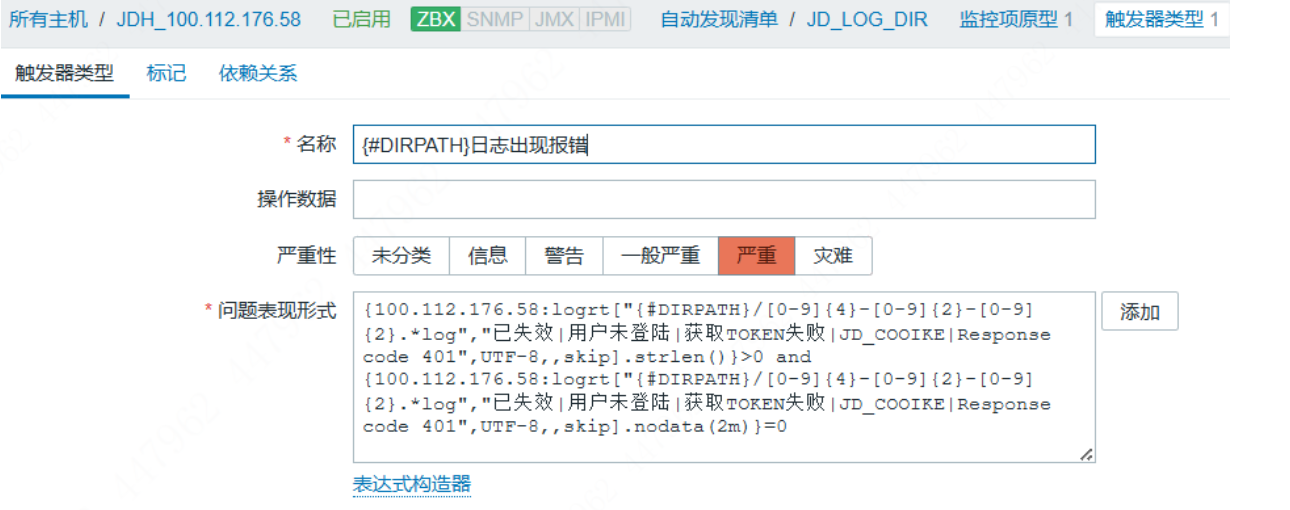 1 | {100.112.176.58:logrt["{#DIRPATH}/[0-9]{4}-[0-9]{2}-[0-9]{2}.*log","已失效|用户未登陆|获取TOKEN失败|JD_COOIKE|Response code 401",UTF-8,,skip].strlen()}>0 and {100.112.176.58:logrt["{#DIRPATH}/[0-9]{4}-[0-9]{2}-[0-9]{2}.*log","已失效|用户未登陆|获取TOKEN失败|JD_COOIKE|Response code 401",UTF-8,,skip].nodata(2m)}=0 |